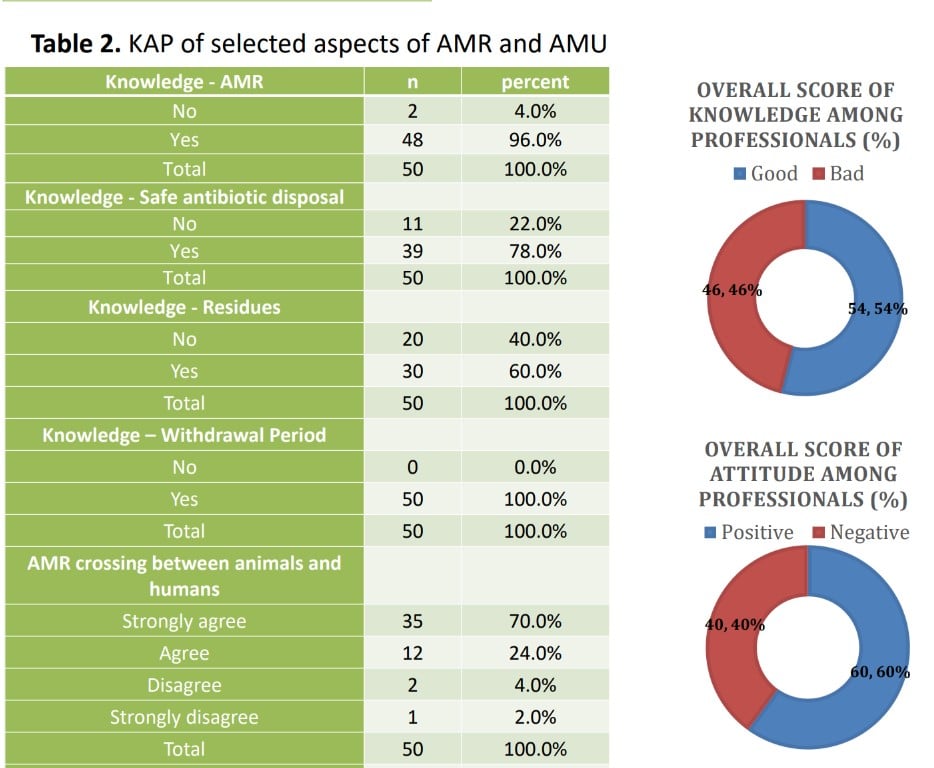 Findings revealed that just over half (54%) of the respondents demonstrated good knowledge of antibiotics and AMR, with those in the Copperbelt performing better than the Lusaka based professionals. 60% of all respondents (63% in Copperbelt and 37% in Lusaka) achieved good attitude scores in relation to AMR, with the vast majority strongly agreeing to the importance of correct disposal of antimicrobials, biosecurity and withdraw period in poultry farming. Additionally, 52% of all respondents (58% in Copperbelt and 42% in Lusaka) received a good score in relation to practices.